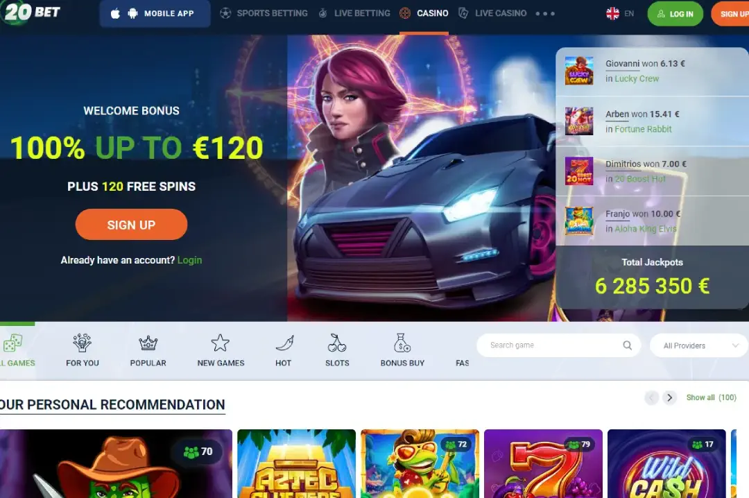 If you’re interested in casino games, the 20Bet sign-up offer grants you a 100% bonus match up to $120 after your first deposit, plus you receive 120 free spins. These spins are valid for the game 'Elvis Frog in Vegas.'